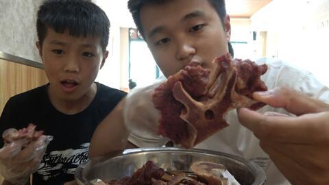 接下来,刘大瓜开始了他的吃骨之旅。他先用牙齿轻轻咬住牛骨头,然后用力一嚼,骨头上的肉就掉了下来。看着那满嘴的肉,刘大瓜的表情瞬间变得满足起来。他一边吃,一边还不忘和观众互动:“怎么样,这骨头味道怎么样?”